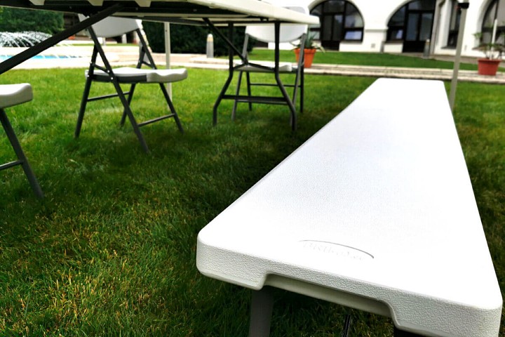 Le design élégant du banc, avec une assise blanche et une structure et des pieds gris, s'adapte à tout intérieur ou extérieur. L'entretien du banc ne prend pas beaucoup de temps. Un nettoyage régulier après utilisation suffit. Les bancs ont été conçus pour fournir rapidement des places assises. Le dépliage du banc prend moins de 30 secondes, ce qui en fait un assistant incomparable dans le domaine du catering ou de la restauration.
