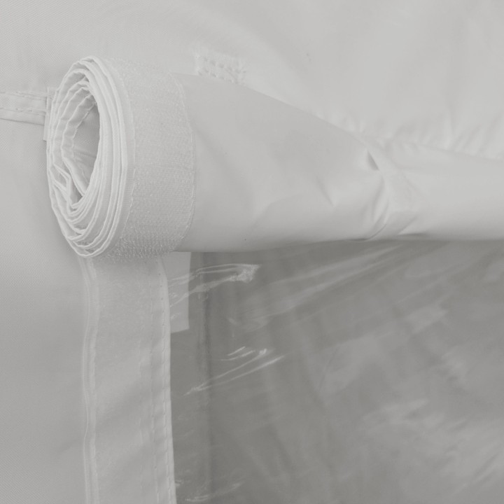 La porte zippée permet un accès facile à la tente. À l’emplacement de la porte se trouve une fenêtre en PVC qui laisse entrer suffisamment de lumière dans la tente, même lorsqu’elle est fermée. Il est également possible de fermer la fenêtre en PVC avec un tissu de la même couleur que la paroi pour créer une paroi pleine. Chaque paroi est fixée au toit avec du velcro de 5 cm. L’installation de la paroi latérale est rapide. La paroi est principalement utilisée par mauvais temps. Sous la tente, vous disposerez d’un espace sûr et sec. Le matériau de la paroi est identique à celui de la toile restante.