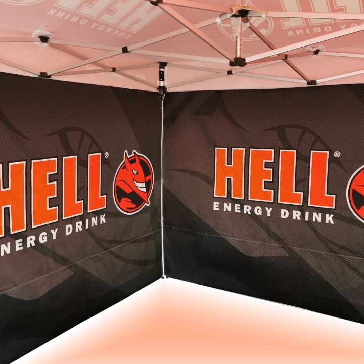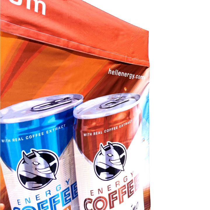 Les couleurs sont très vives, cette méthode reflète parfaitement chaque détail des tentes publicitaires. Les couleurs intenses attirent l'attention et la sublimation garantit une utilisation durable sans perte de couleur. Dans cette méthode, le prix reste constant quelle que soit la taille de l'impression (la taille de l'impression n'influence pas le prix, le prix des murs ou du toit reste inchangé). Plus l'impression est grande, plus la publicité est visible.