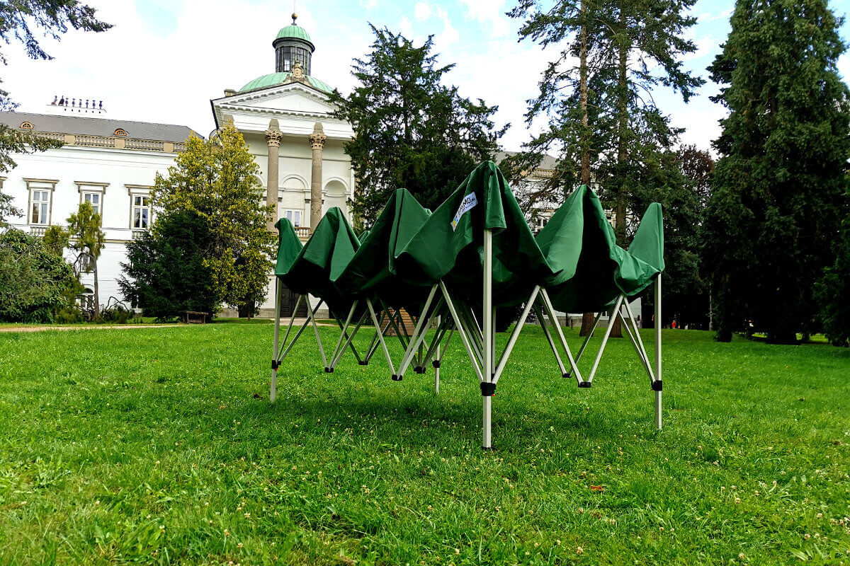 Notre système en accordéon ne nécessite aucun outil ni compétence particulière. Grâce à son mécanisme intelligent, deux personnes peuvent monter la tente en quelques minutes. Tous les raccords sont vissés, ce qui permet un remplacement facile des pièces individuelles si nécessaire – contrairement aux versions bon marché rivetées. Ce système vous fait gagner un temps précieux lors de chaque événement.