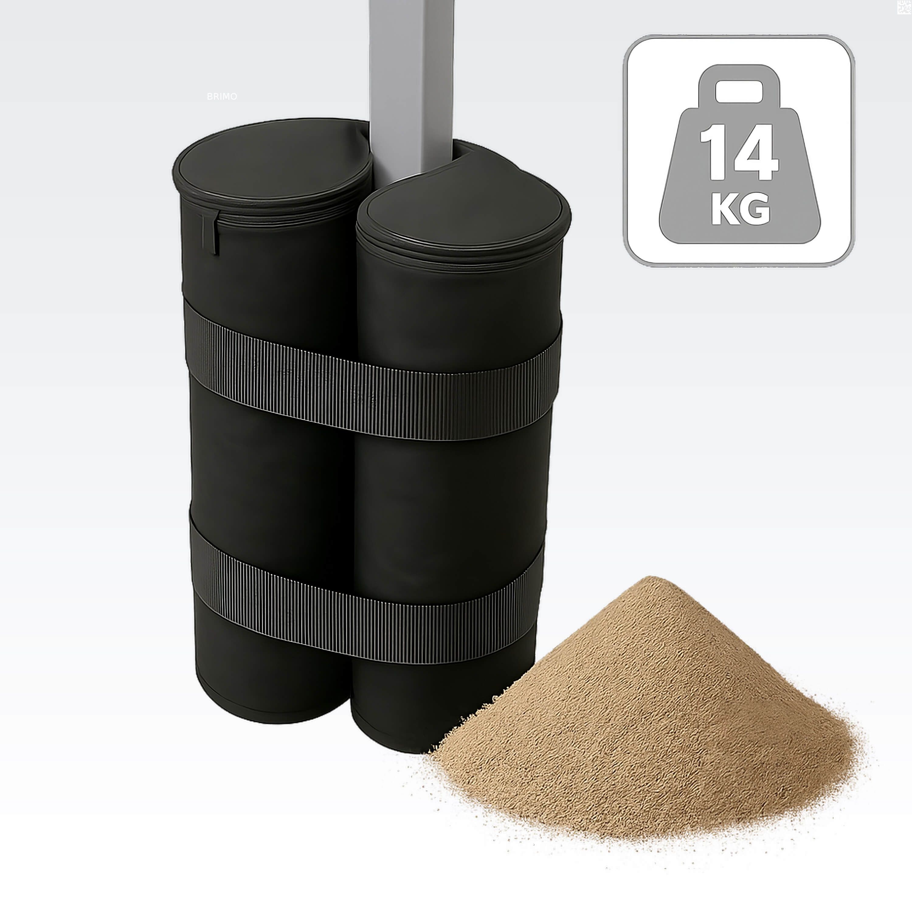 Nous recommandons d’utiliser du sable à grains plus gros. Le sable n’est pas inclus dans l’ensemble. Les sacs se fixent aux pieds de la tente à l’aide de velcros. Par temps venteux, nous recommandons également d’ancrer la tente avec des cordes et des piquets, disponibles également dans les accessoires.