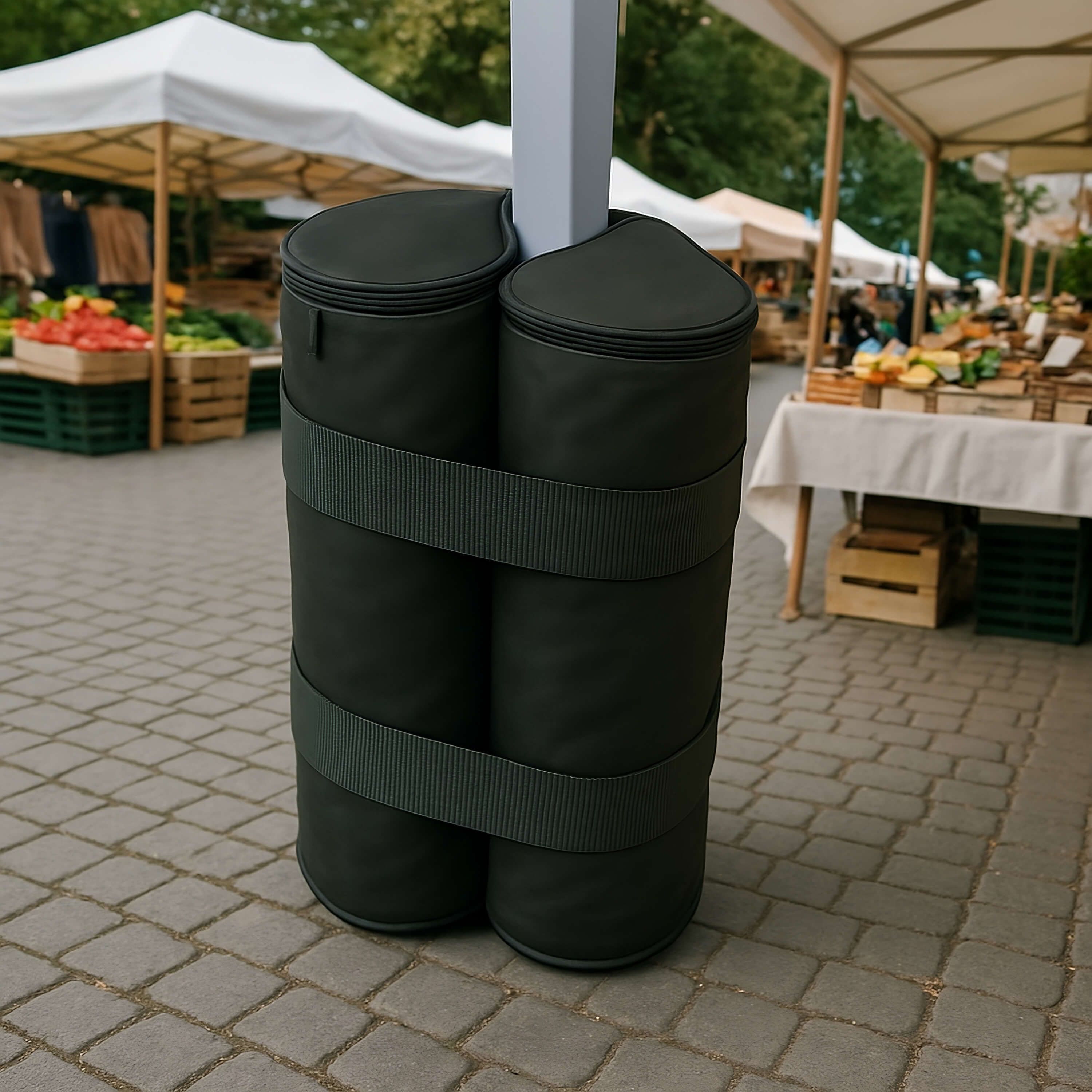 - Une fois rempli de sable, deux cylindres reliés se forment, qui se fixent autour du pied de la tente de réception en quelques secondes.