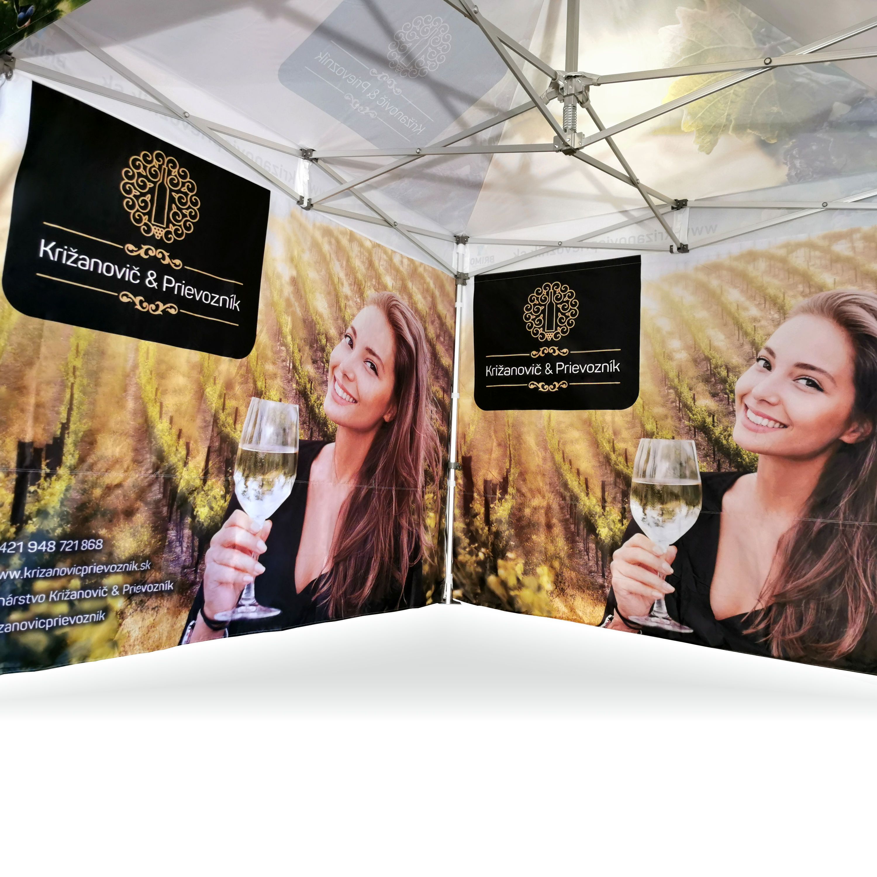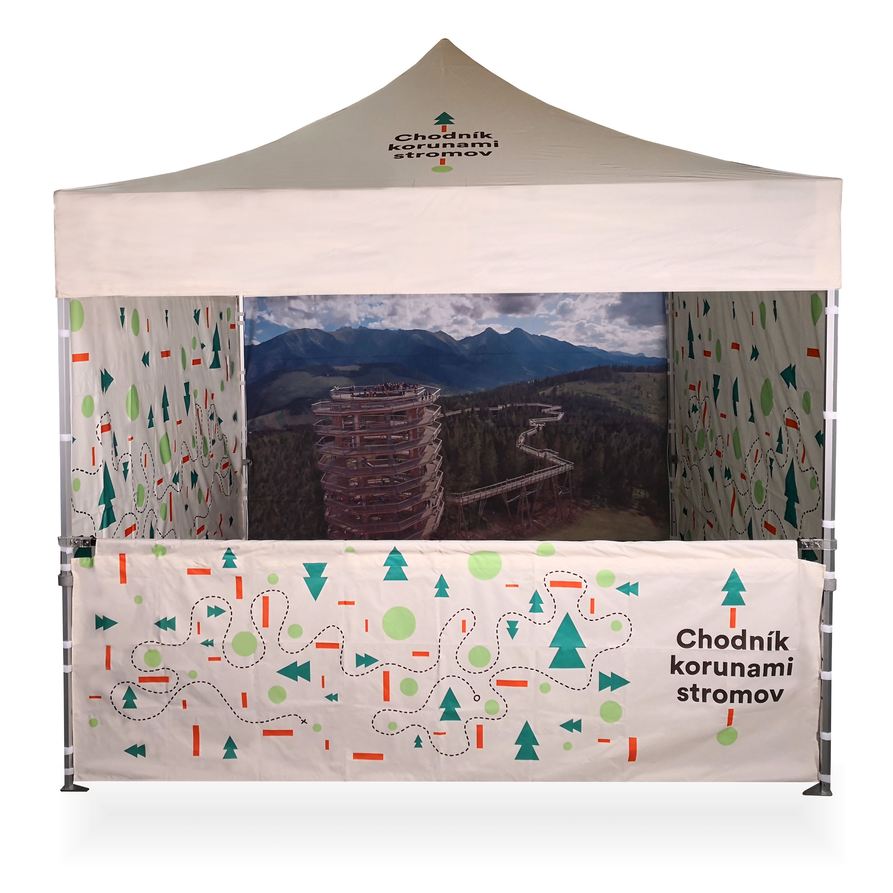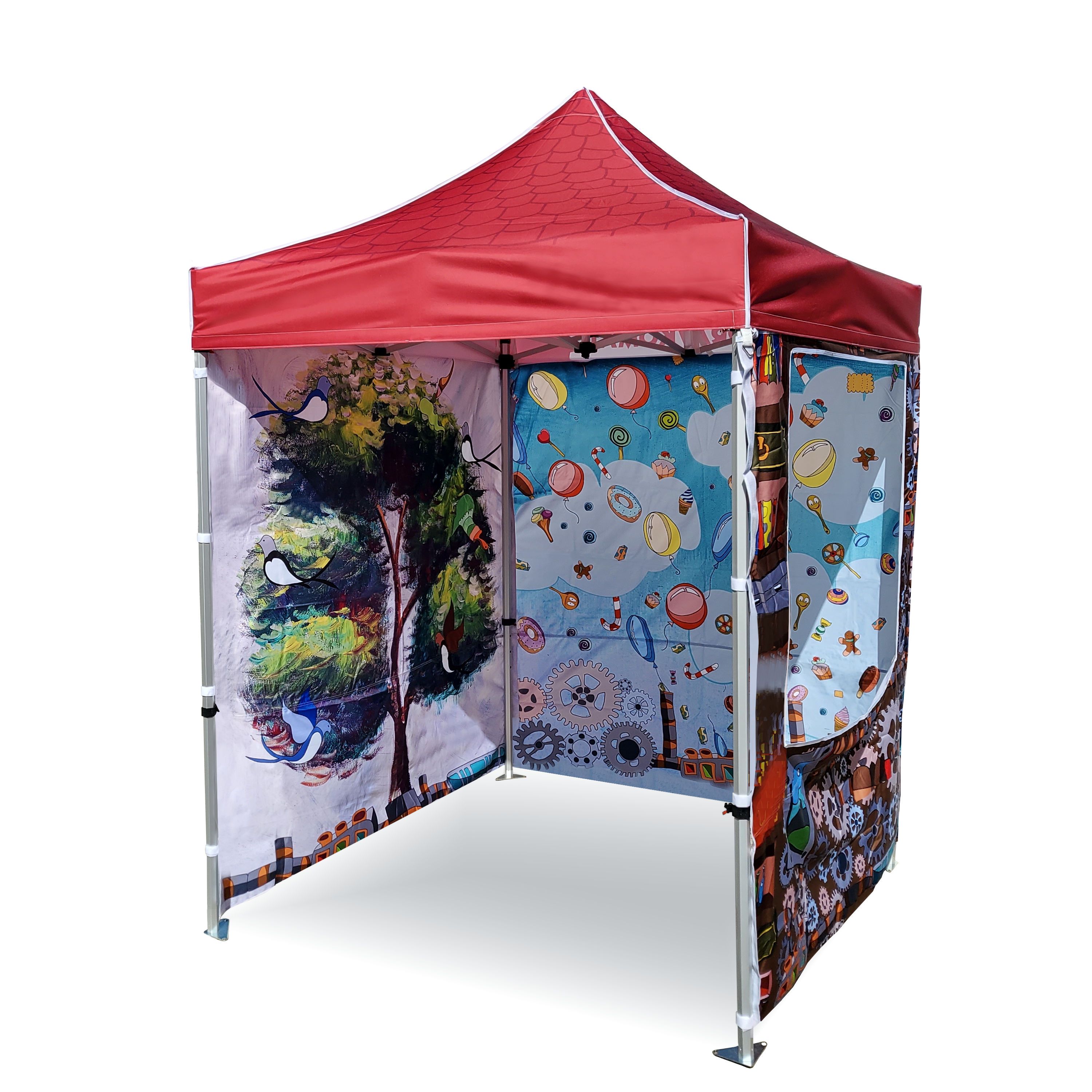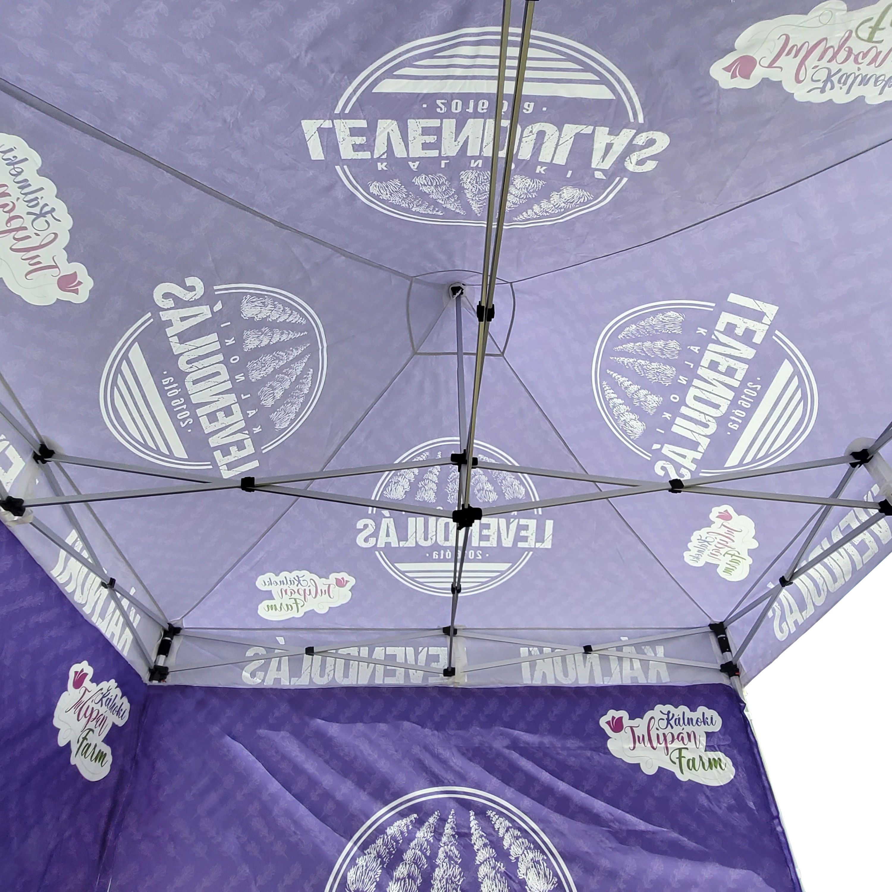 Les couleurs sont très vives, cette méthode reflète parfaitement chaque détail des tentes publicitaires. Les couleurs intenses attirent l'attention et la sublimation garantit une utilisation durable sans perte de couleur. Dans cette méthode, le prix reste constant quelle que soit la taille de l'impression (la taille de l'impression n'influence pas le prix, le prix des murs ou du toit reste inchangé). Plus l'impression est grande, plus la publicité est visible.