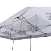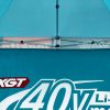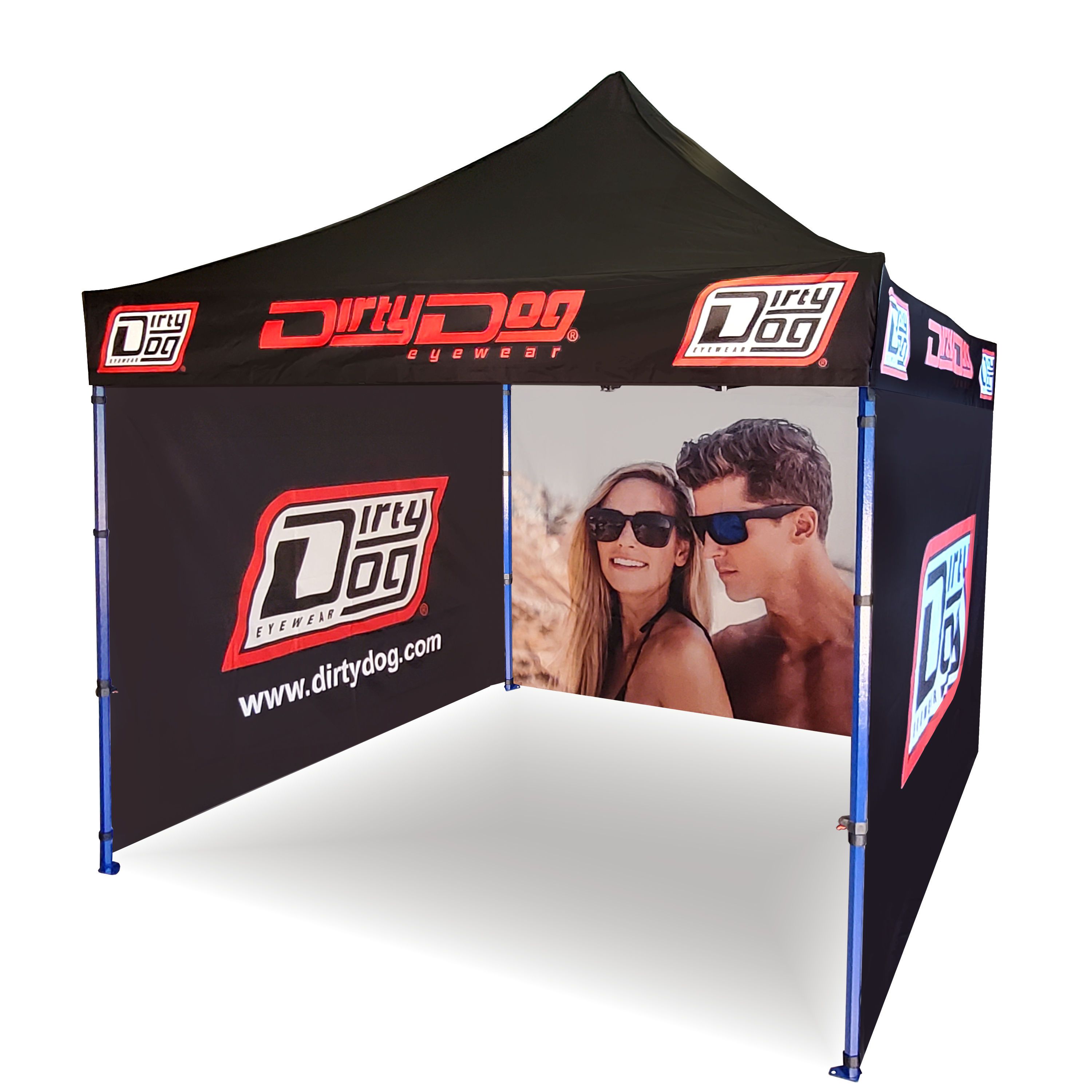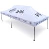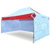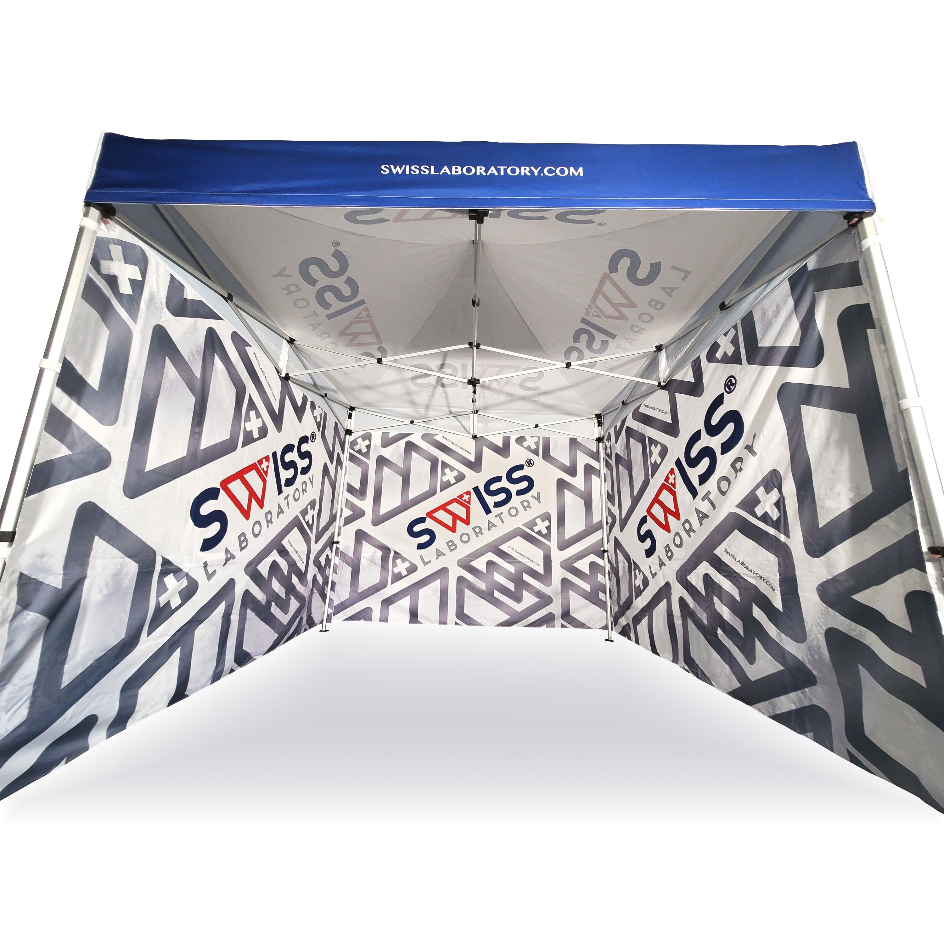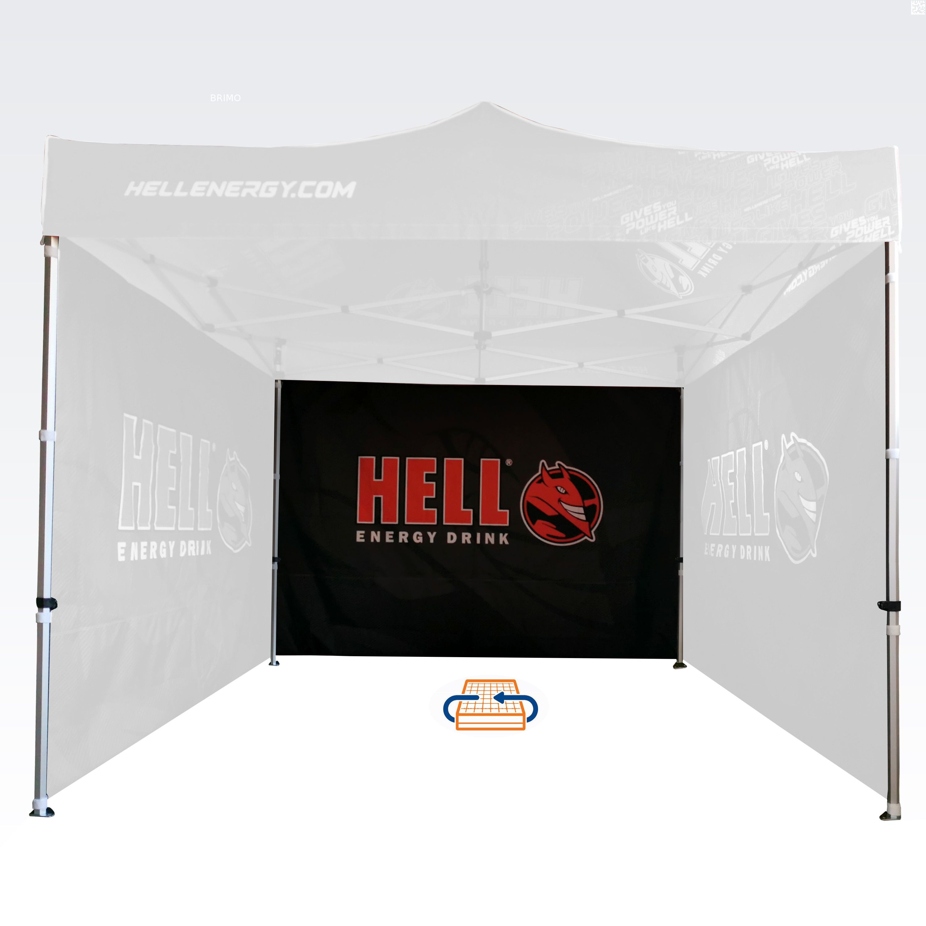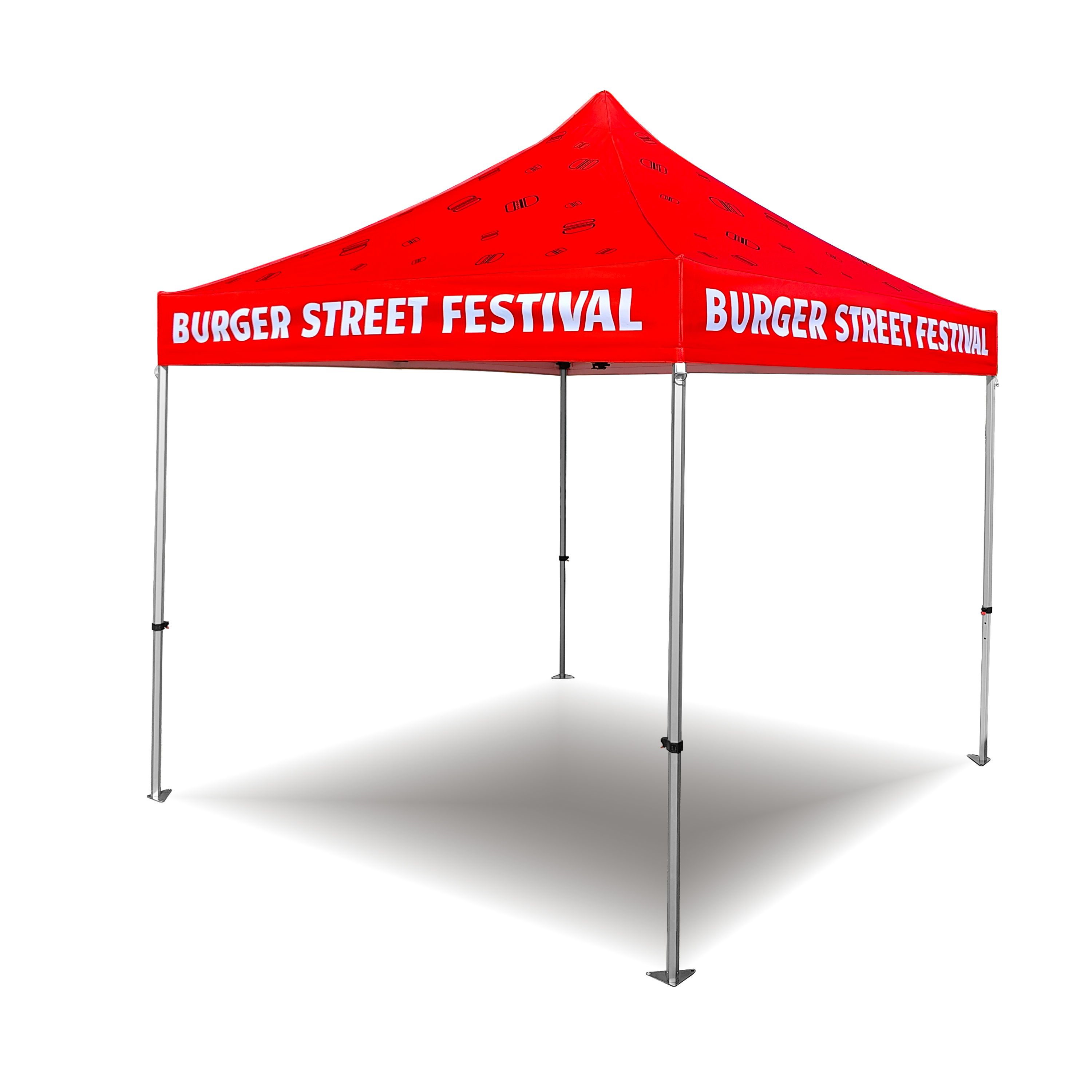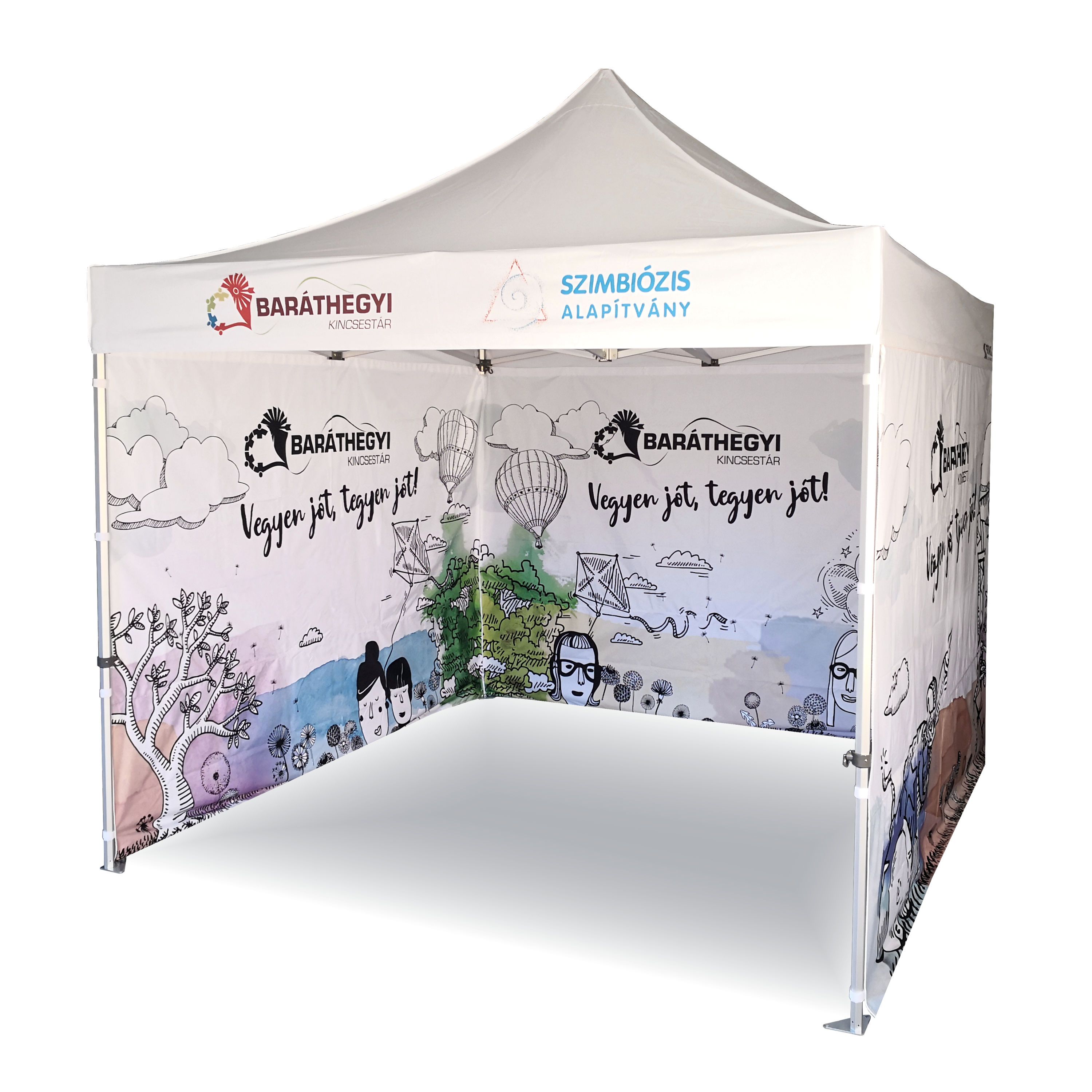 Tentes publicitaires avec impression numérique par sublimation. L'impression se fait par un processus chimique où l'encre, sous l'effet de la chaleur, pénètre directement dans la structure du tissu. Logo, texte ou tout type de graphisme sur la face intérieure ou extérieure de la tente, selon les souhaits du client.