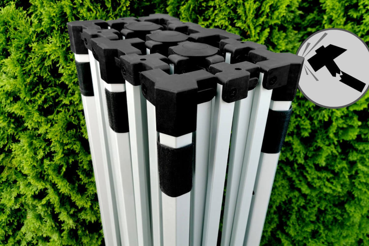 Le mécanisme de déploiement rapide vous permet de créer un vaste espace couvert pour vos produits et clients en moins d'une minute, et ce, sans aucun outil. La stabilité de cette tente mobile repose sur un profilé robuste en aluminium à section hexagonale. Les larges platines au bas des pieds assurent un ancrage fiable au sol, tandis que les raccords vissés de qualité garantissent une manipulation fluide et facilitent l'entretien éventuel.