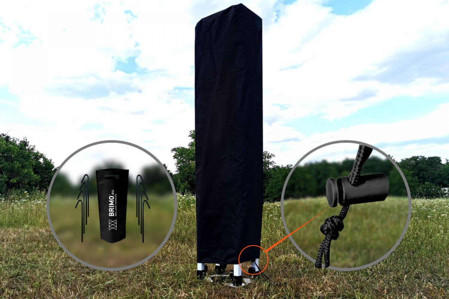 - Modèle Exclusive Acier utilisé par vent jusqu'à 50 km/h. Pieds avec trous pour l'ancrage au sol à l'aide de piquets – offerts !