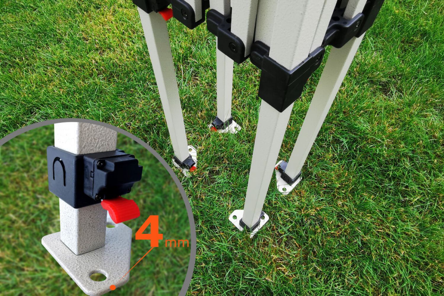 - Résistance au vent : Le modèle en super acier résiste à des vents allant jusqu'à 40 km/h. Les pieds de la structure sont équipés de trous pour un ancrage solide. Vous recevrez les piquets d'ancrage avec la tente tout à fait gratuitement pour votre sécurité maximale.