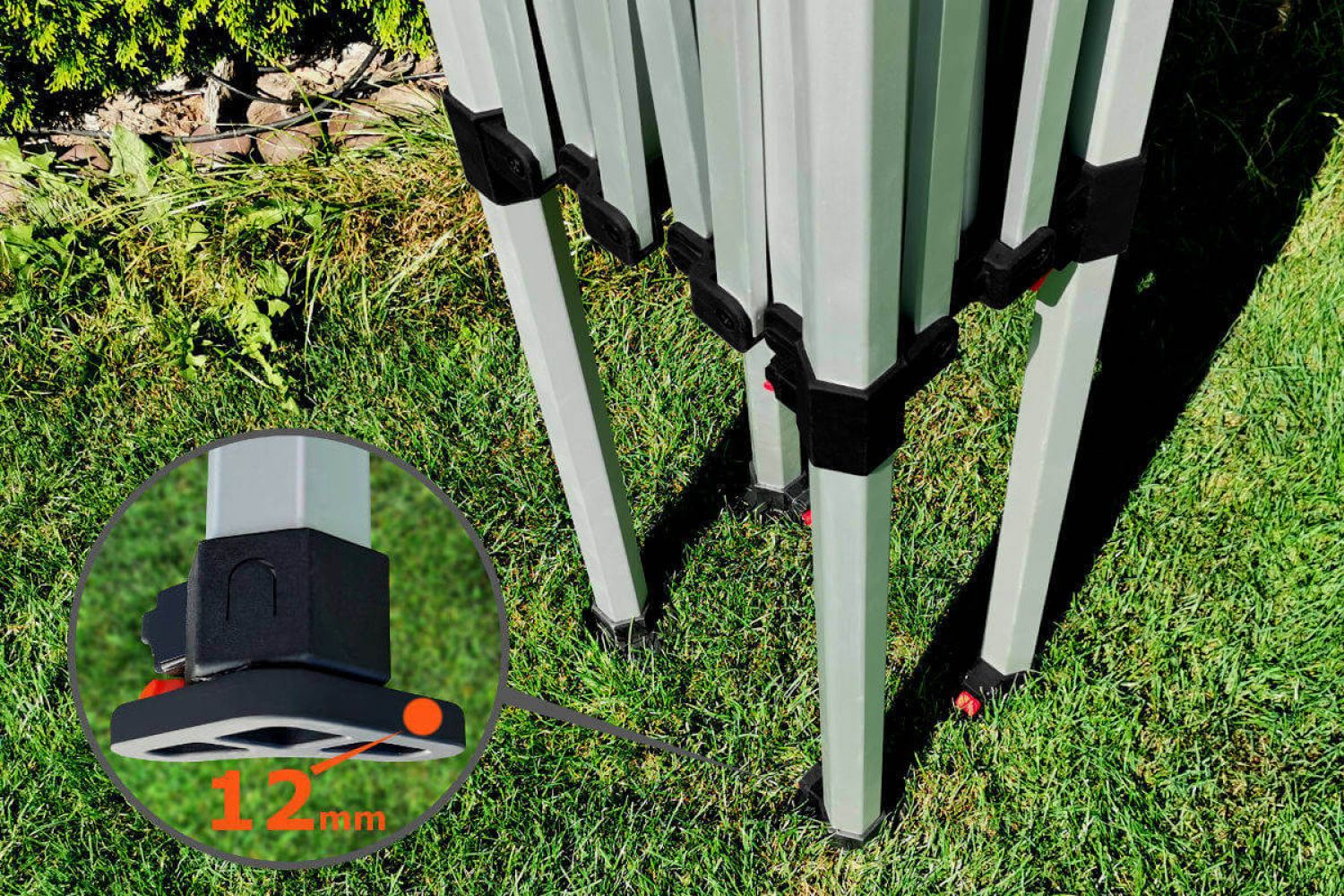 - Résistance au vent : Le modèle Exclusive en aluminium résiste à des vents allant jusqu'à 60 km/h. Les pieds sont dotés de trous prévus pour un ancrage solide. Vous recevrez les sardines d'ancrage avec la tente tout à fait gratuitement pour votre sécurité maximale.